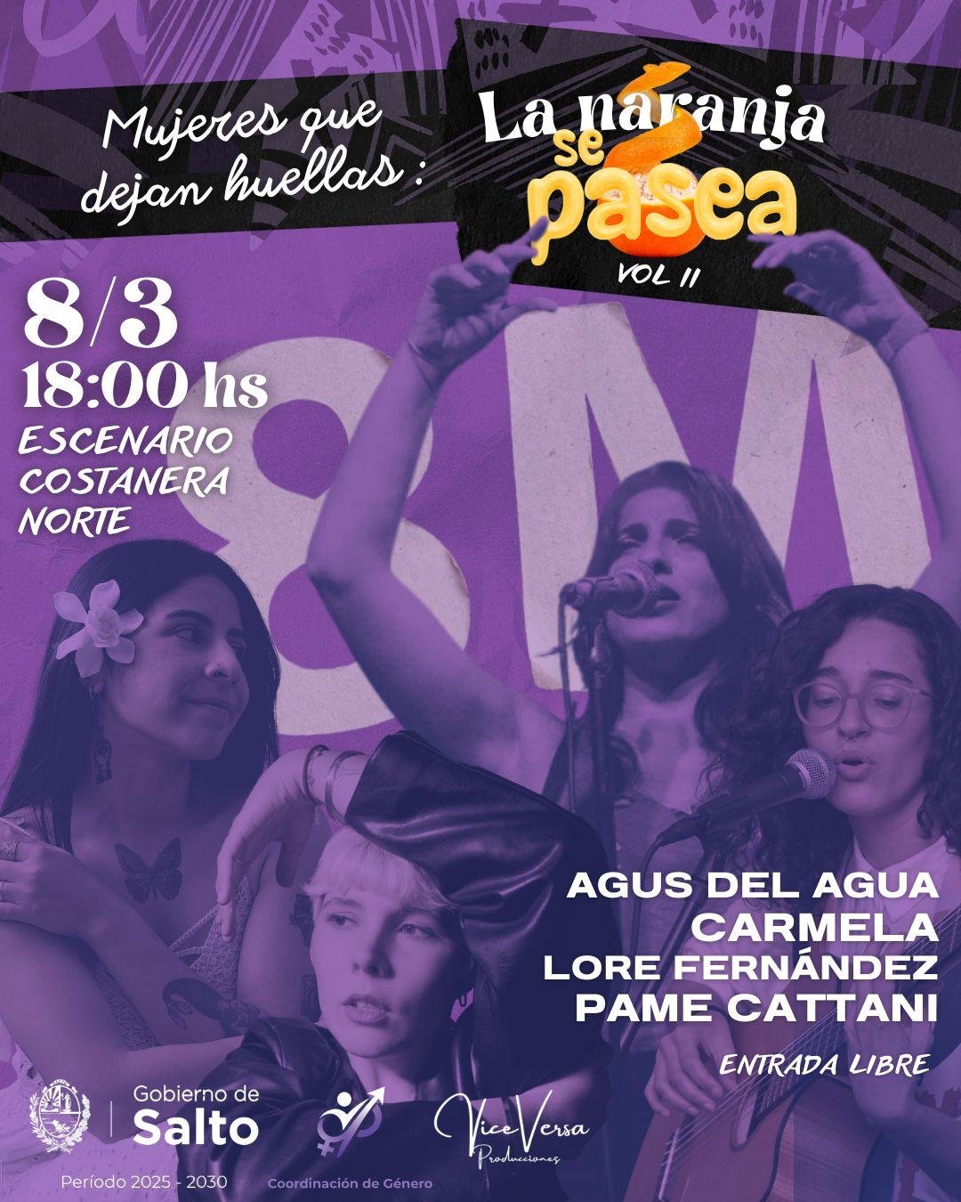 En el marco del Día Internacional de las Mujeres, la Coordinación de Género, en conjunto con Vice Versa Producciones, invita a la ciudadanía a participar de la actividad «Mujeres que dejan huellas: La naranja se pasea Vol. II». El evento tendrá lugar este domingo 8 de marzo, a partir de las 18:00 horas, en el escenario de la Costanera Norte.