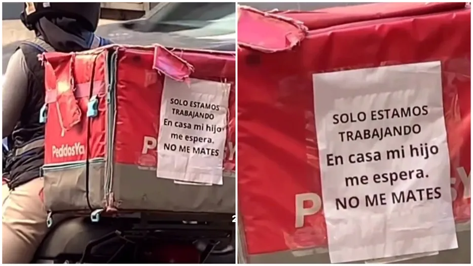 Un repartidor de la aplicación PedidosYa pegó en su mochila de reparto un cartel. Esto, tras el asesinato de tres repartidores ocurridos en los últimos 10 días.
