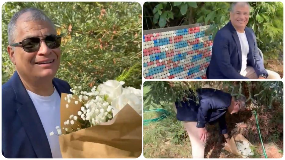 A los pocos minutos compartió un video desde la “sala de reuniones” de Mujica y Topolansky: el jardín con los bancos hechos de tapas de refrescos. “Acá se sentaba el Pepe, Lucía, acá los invitados. Yo nunca había venido a su chacra, lástima que no vine en vida de Pepe. Qué emoción estar aquí”, confesó el ecuatoriano.