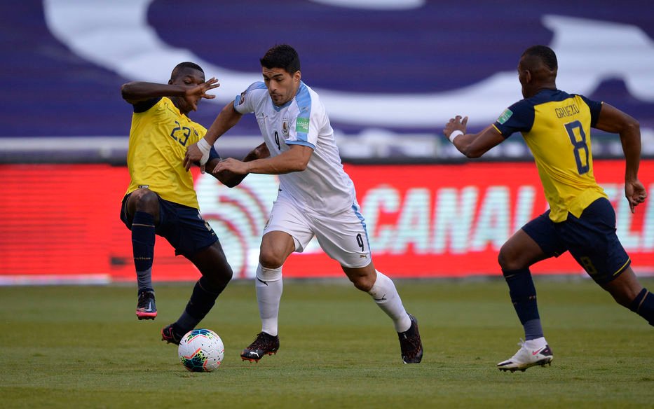Uruguay's Luis Suarez (C) vies for the ball with Ecuador's Moises Caicedo (L) and Ecuador's Carlos Gruezo during their 2022 FIFA World Cup South American qualifier football match at the Rodrigo Paz Delgado Stadium in Quito on October 13, 2020, amid the COVID-19 novel coronavirus pandemic. (Photo by RODRIGO BUENDIA / POOL / AFP)